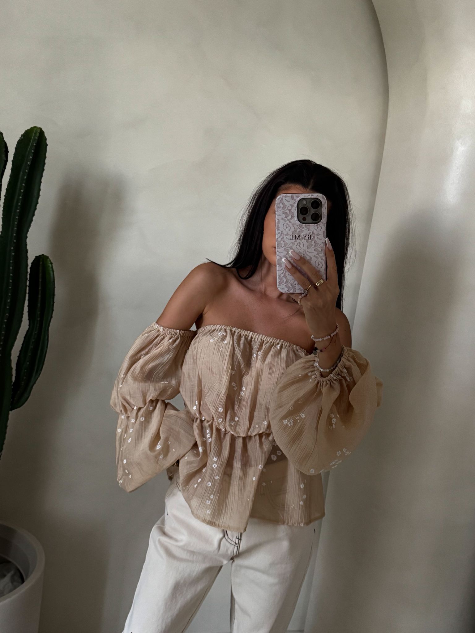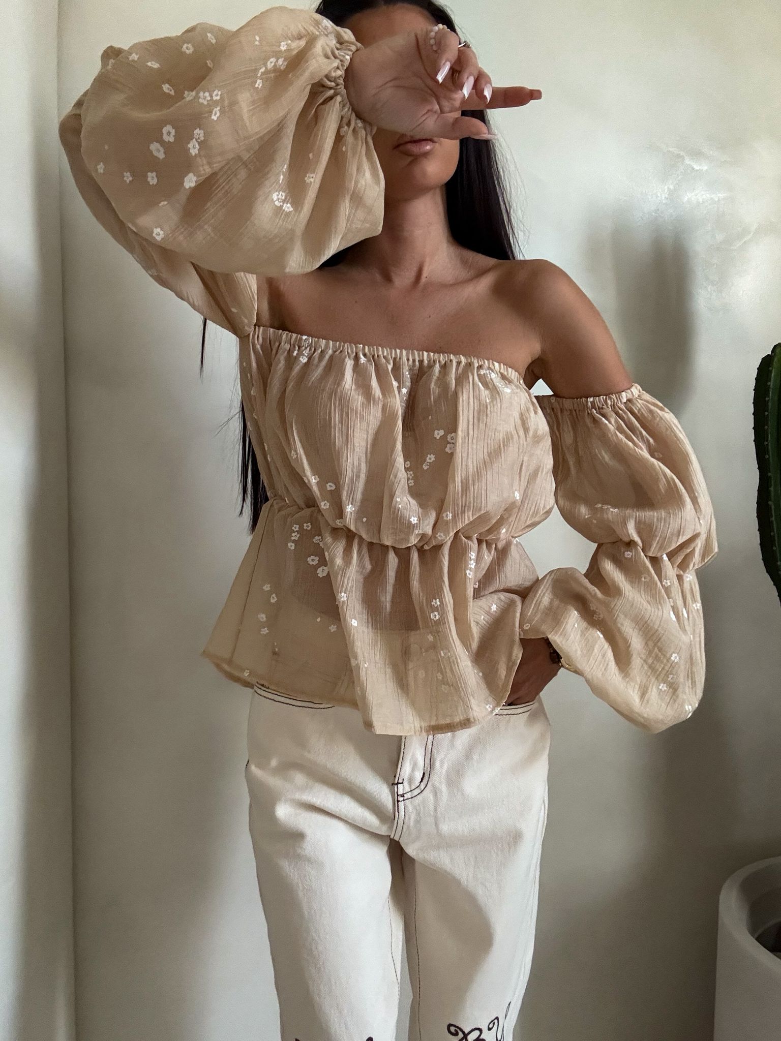 Bluzka typu hiszpanka – z odkrytymi ramionami i elastycznym wykończeniem przy dekolcie. Rękawy są długie, lekko bufiaste, zakończone gumeczką.