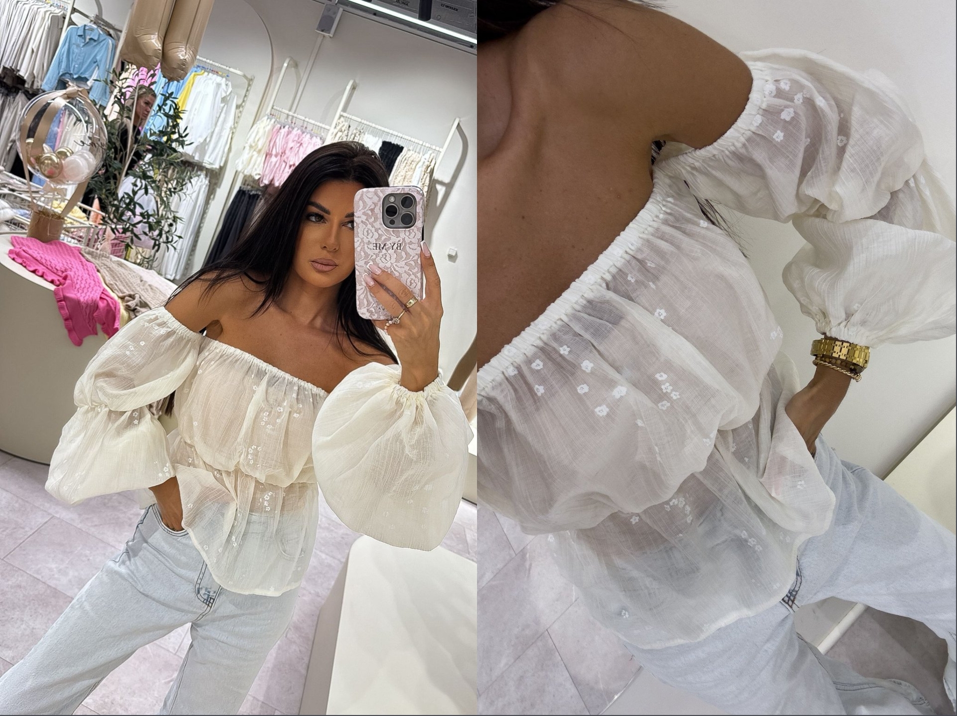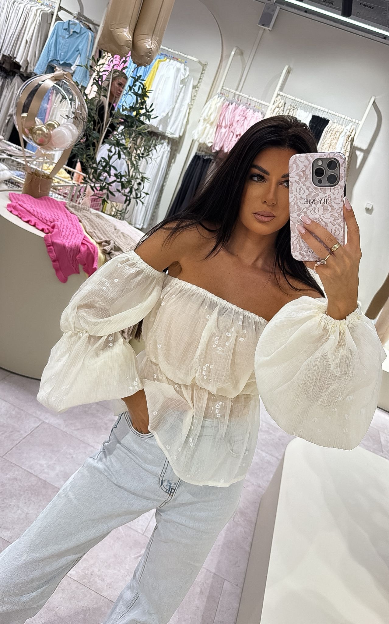 Bluzka typu hiszpanka – z odkrytymi ramionami i elastycznym wykończeniem przy dekolcie. Rękawy są długie, lekko bufiaste, zakończone gumeczką.
