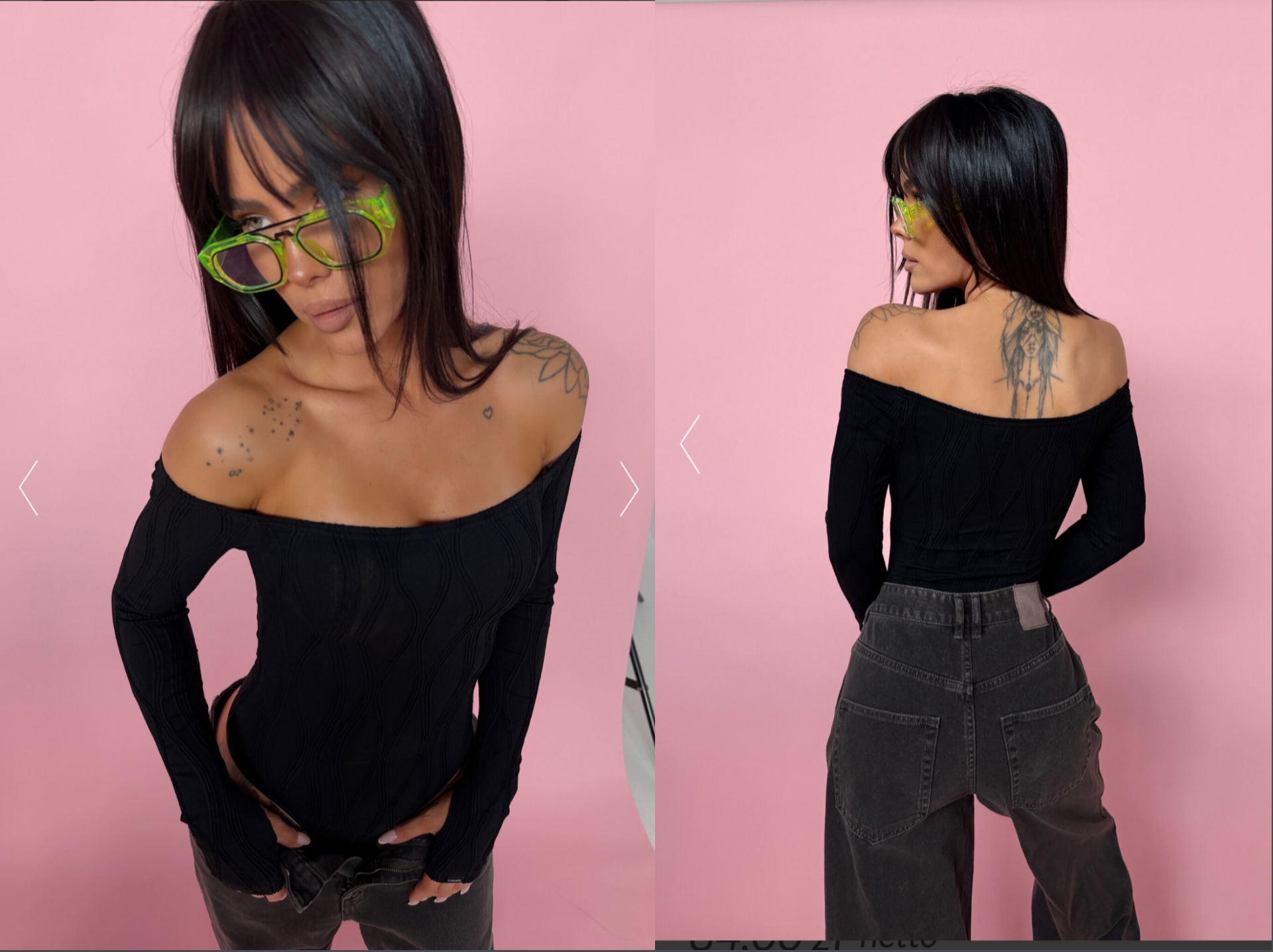 Body o dopasowanym kroju, wykonane z elastycznego materiału z wyraźną, strukturalną fakturą. Model z odkrytymi ramionami i długim rękawem, który podkreśla linię dekoltu i sylwetkę. Na rękawie subtelna metka dodająca charakteru. Całość tworzy kobiecą, nowoczesną formę idealną do stylizacji na co dzień i na wyjście.