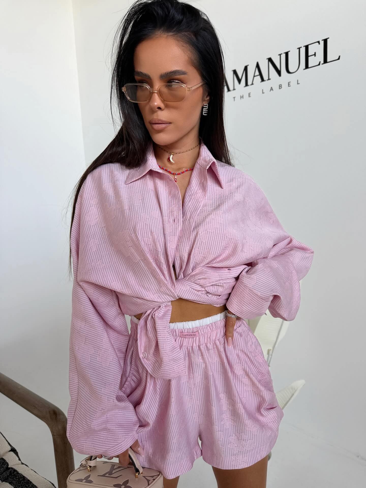 Swobodna forma z dopracowanym detalem, który zmienia charakter całej sylwetki. Luźniejsza, wydłużona koszula daje efekt lekkości i nonszalancji, a dzięki zapięciu na guziki po bokach można ją modelować w talii, podkreślając proporcje i nadając bardziej kobiecej linii. Delikatna struktura materiału dodaje głębi i subtelnej elegancji, zachowując przy tym codzienny komfort. Szorty z podwójną gumą w pasie idealnie dopasowują się do sylwetki, zapewniając wygodę i stabilne ułożenie. Całość tworzy nowoczesny, lekko wakacyjny look, który łączy luz z wyrafinowanym wykończeniem.