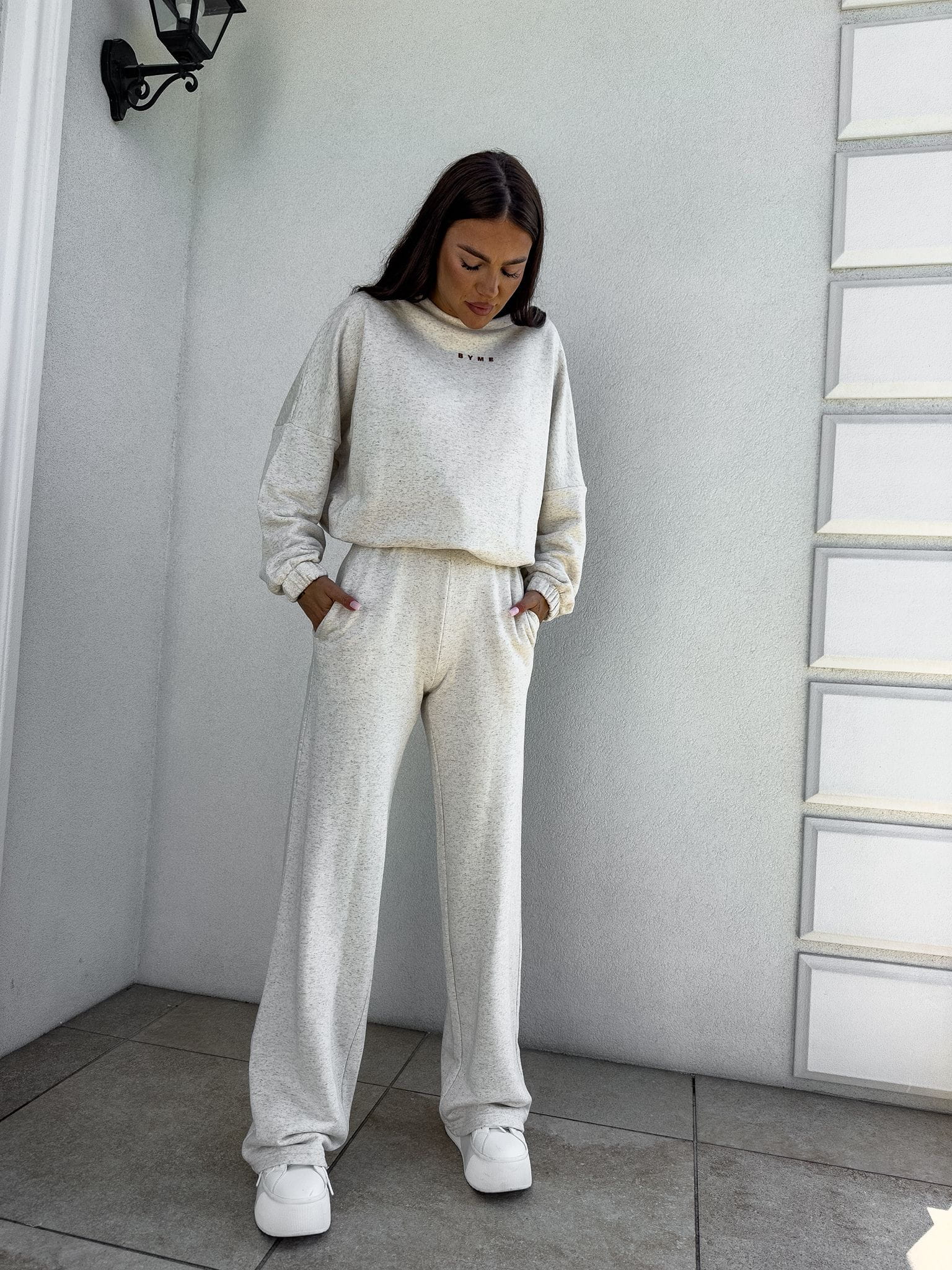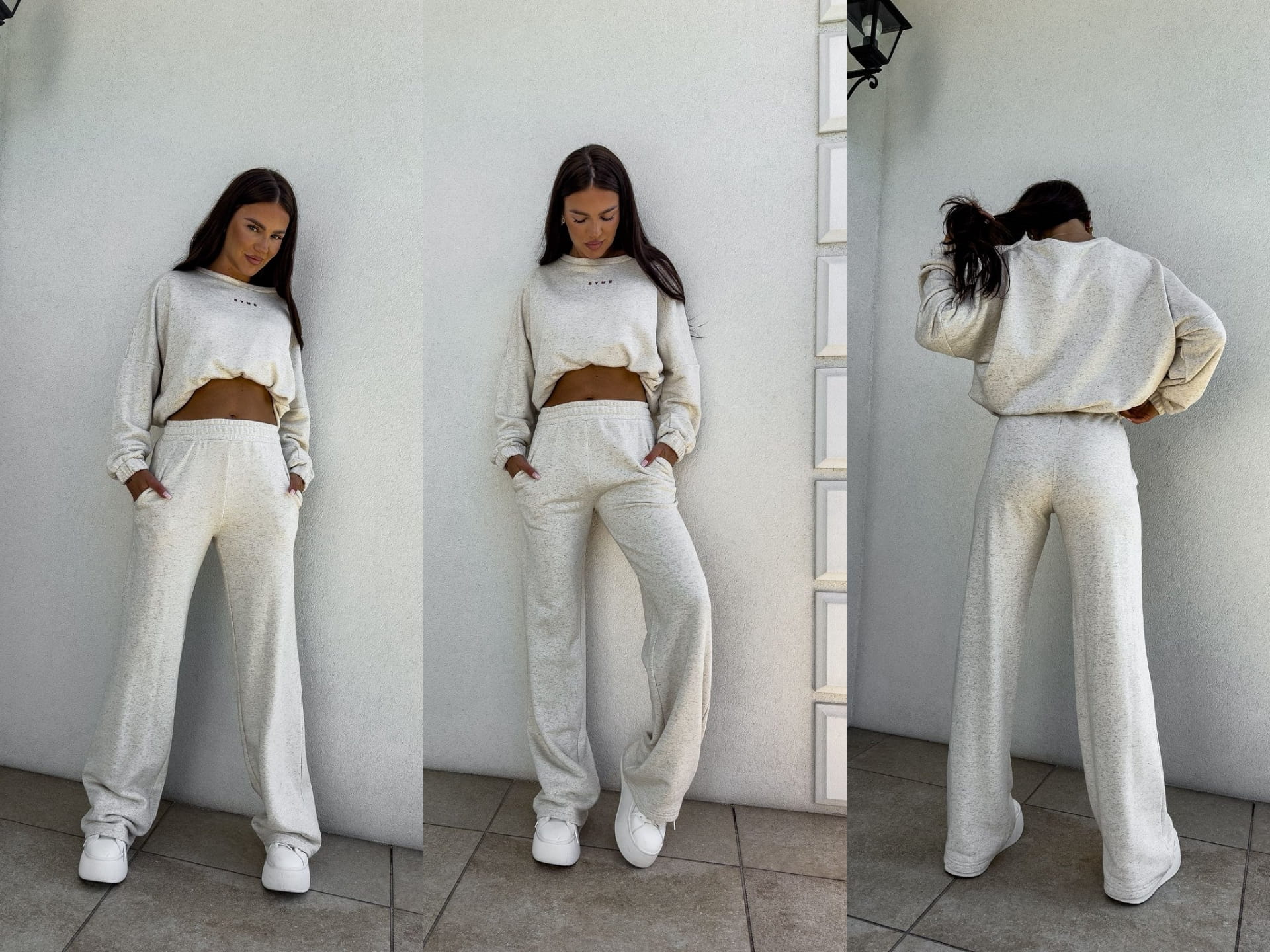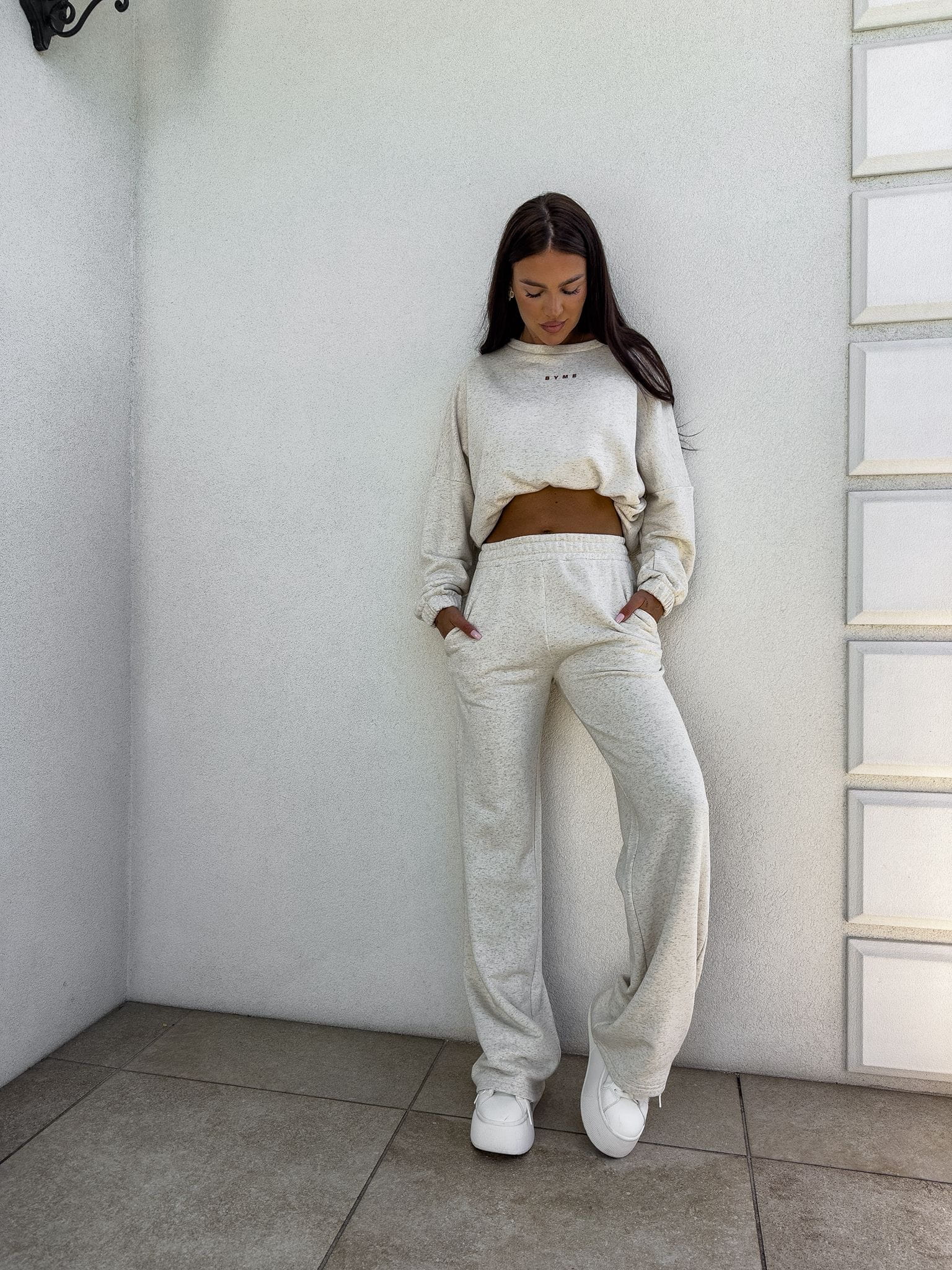 Komplet Sydney składający się z bluzy i spodni. Bluza o prostym, luźnym kroju, z długim rękawem zakończonym gumą. Szerokie spodnie z gumką w pasie