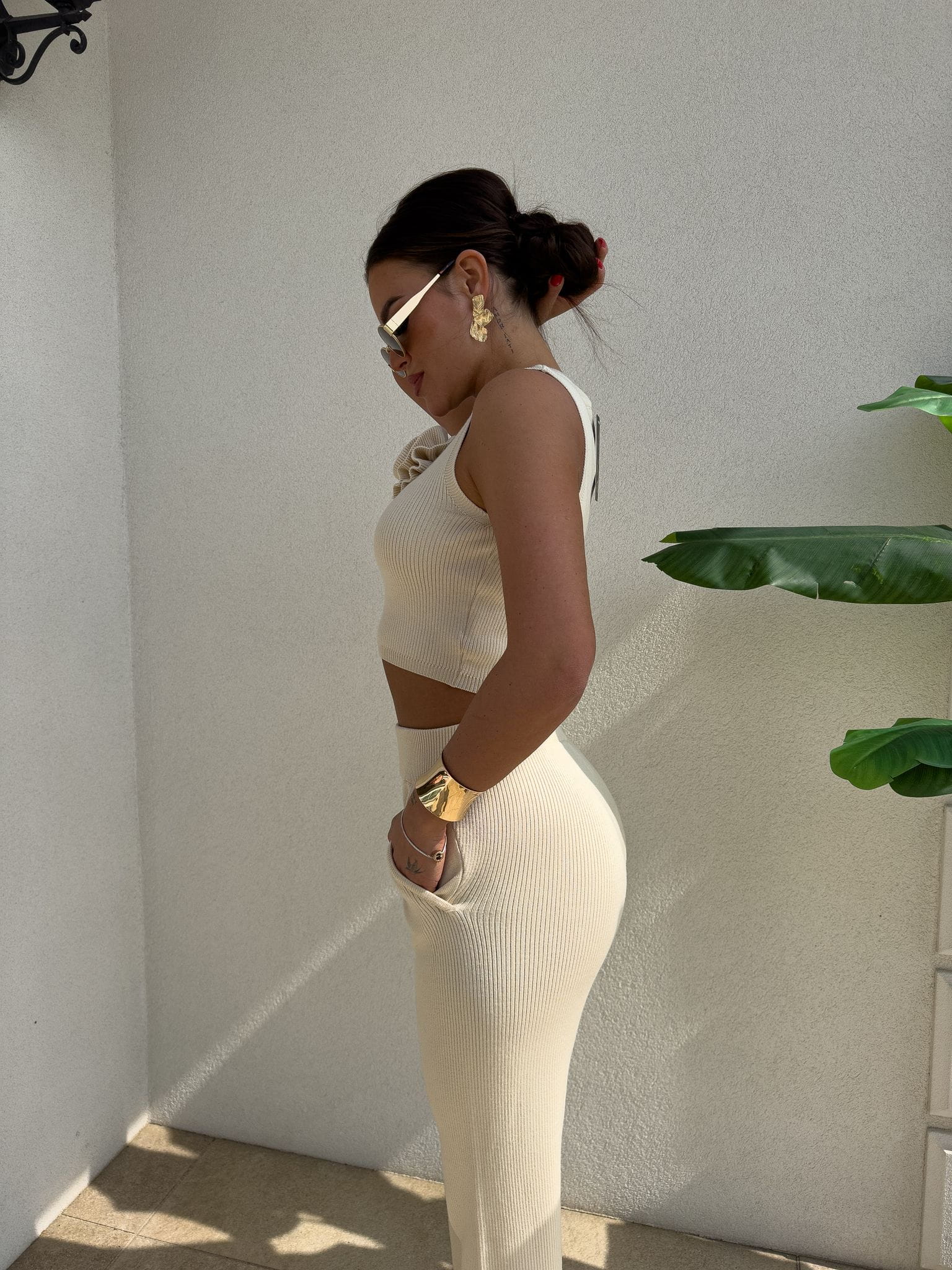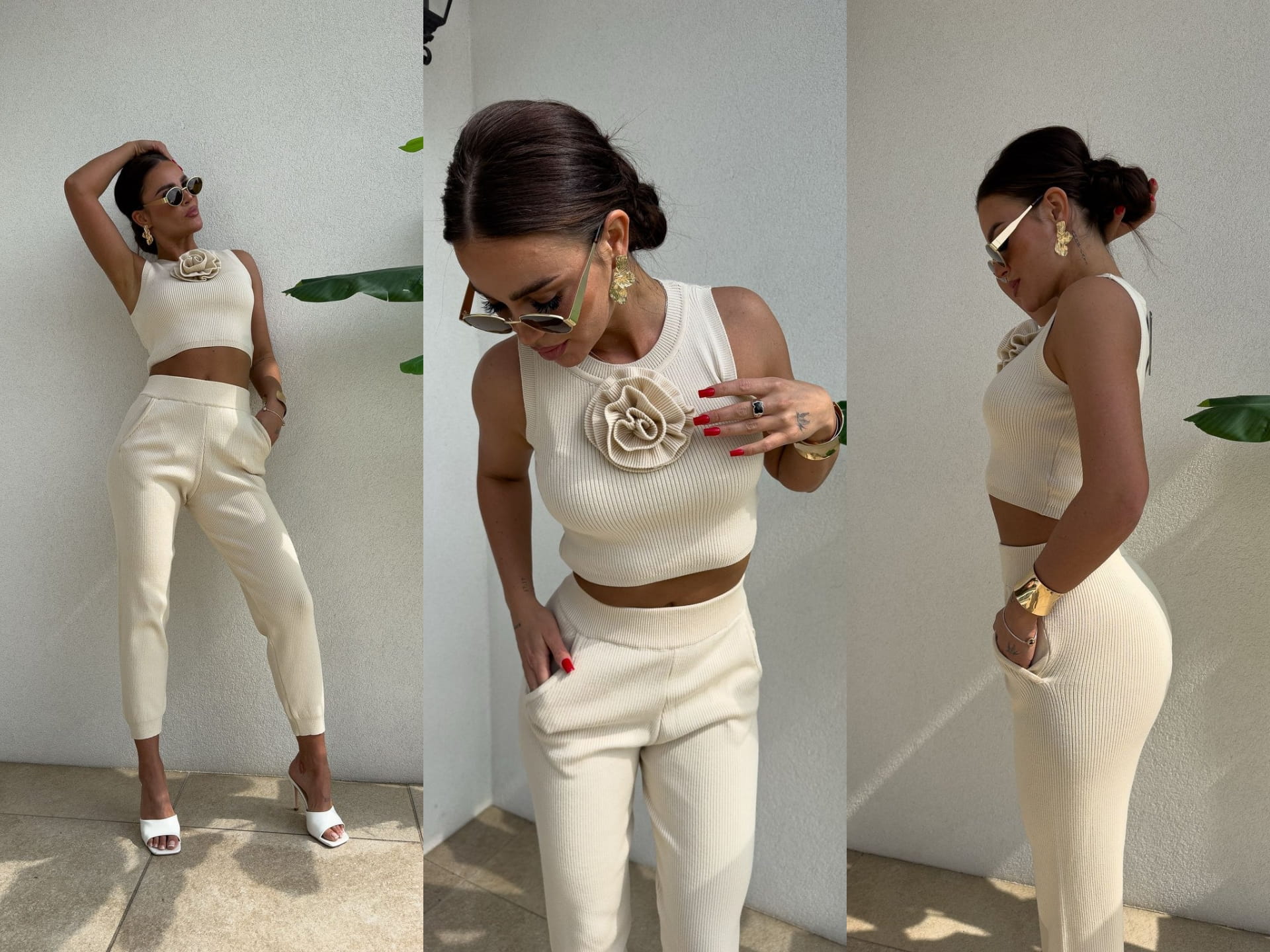 Stylowy komplet damski składający się z krótkiego topu bez rękawów oraz długich, wygodnych spodni z elastyczną gumką w pasie. Zestaw łączy w sobie komfort i modny wygląd – idealny zarówno na co dzień, jak i na specjalne okazje. Dodatkowym atutem jest dekoracyjny kwiat, który można dowolnie odpinać, dostosowując stylizację do własnych upodobań.