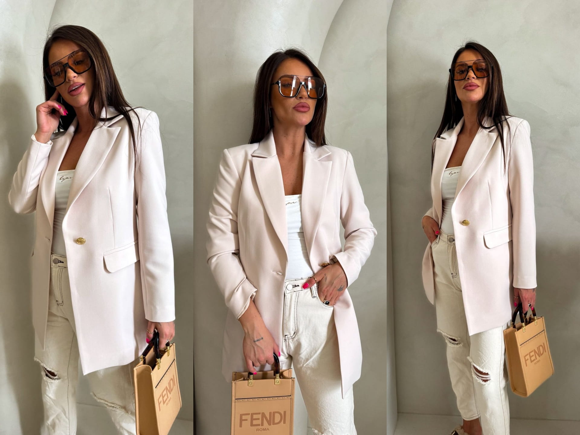 Marynarka o klasycznym, eleganckim fasonie. Jest delikatnie dopasowana w talii, dzięki czemu subtelnie podkreśla sylwetkę. Posiada jednorzędowe zapięcie na jeden guzik oraz klasyczne klapy o średniej szerokości. Po bokach znajdują się dwie kieszenie z patkami. Długość marynarki sięga poniżej bioder, co zapewnia eleganckie proporcje. Długie rękawy mają prosty krój.