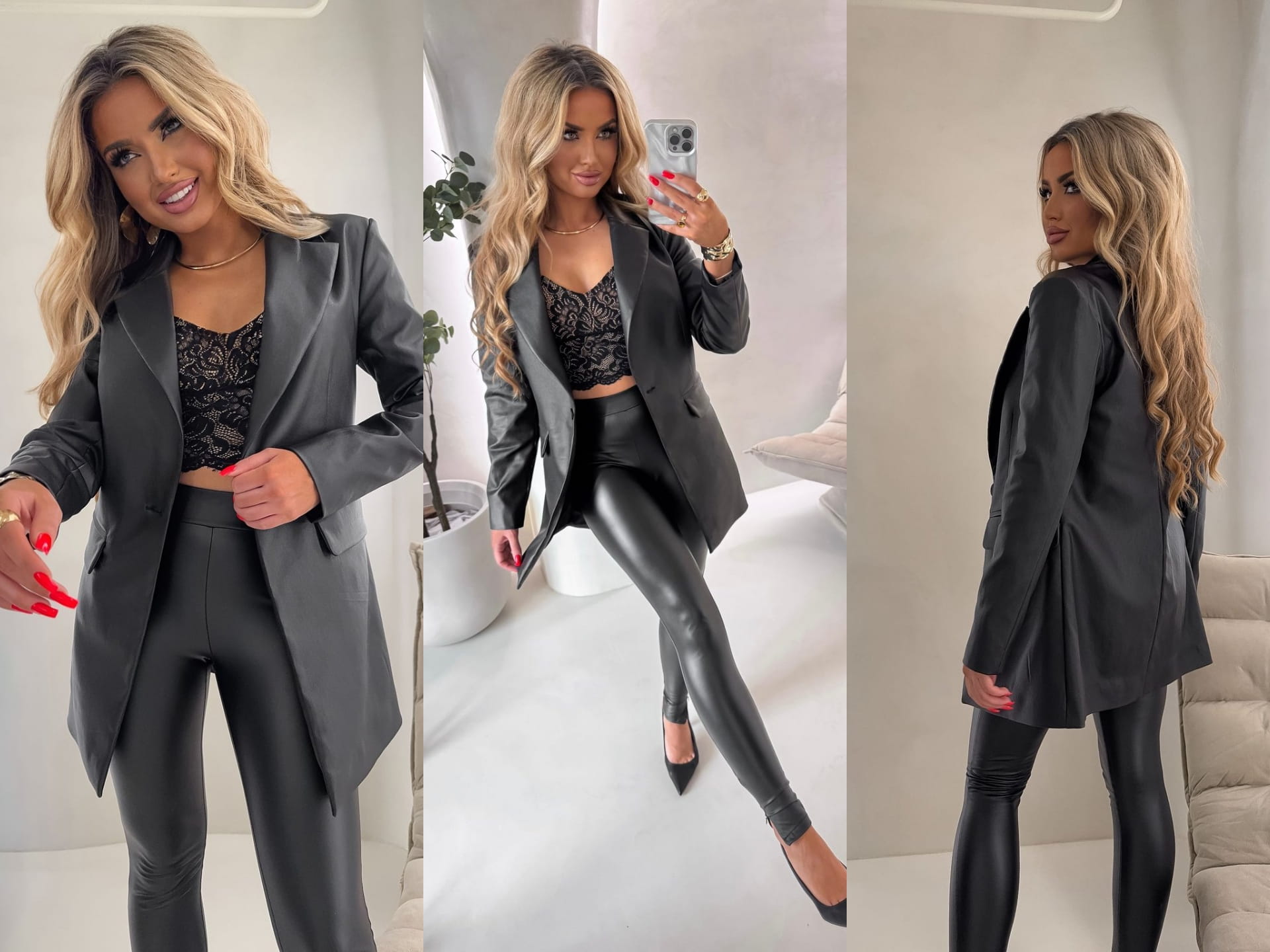 Marynarka o klasycznym, eleganckim fasonie. Jest delikatnie dopasowana w talii, dzięki czemu subtelnie podkreśla sylwetkę. Posiada jednorzędowe zapięcie na jeden guzik oraz klasyczne klapy o średniej szerokości. Po bokach znajdują się dwie kieszenie z patkami. Długość marynarki sięga poniżej bioder, co zapewnia eleganckie proporcje. Długie rękawy mają prosty krój.