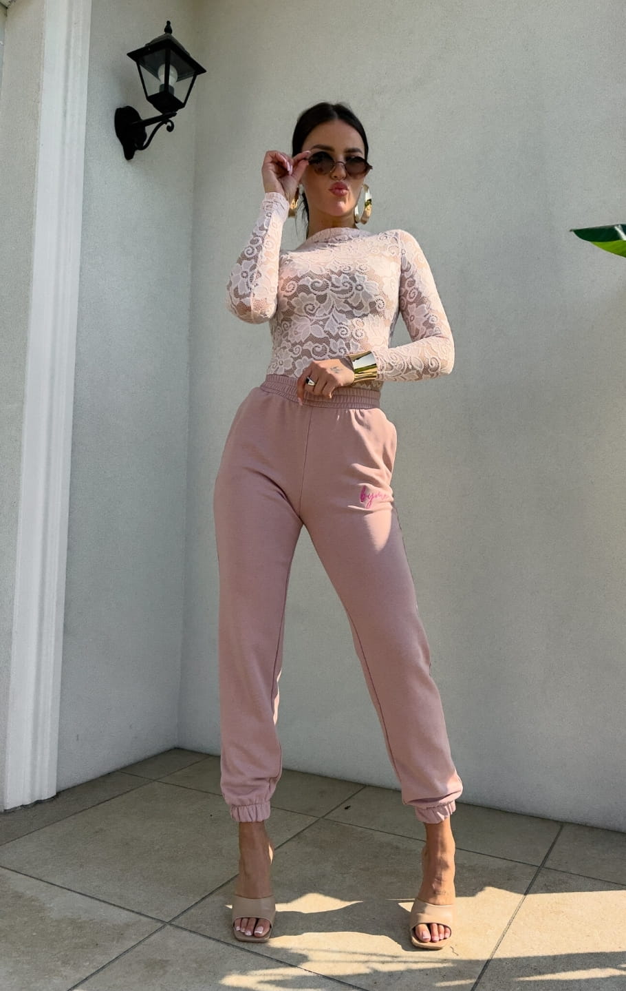 Spodnie dresowe wykonane z miękkiego materiału, idealne do codziennego użytku oraz aktywności sportowych. Nogawki zakończone są praktyczną gumką, która zapewnia wygodę i dopasowanie do ciała. W pasie znajduje się elastyczna gumka, która umożliwia komfortowe noszenie i odpowiednie dopasowanie. Spodnie ozdobione są subtelnym logowaniem na nogawce w delikatnym, różowym kolorze, co dodaje im modnego i stylowego charakteru. Wyposażone są w praktyczne kieszenie po bokach, idealne do przechowywania drobnych przedmiotów. Idealne połączenie funkcjonalności i designu.