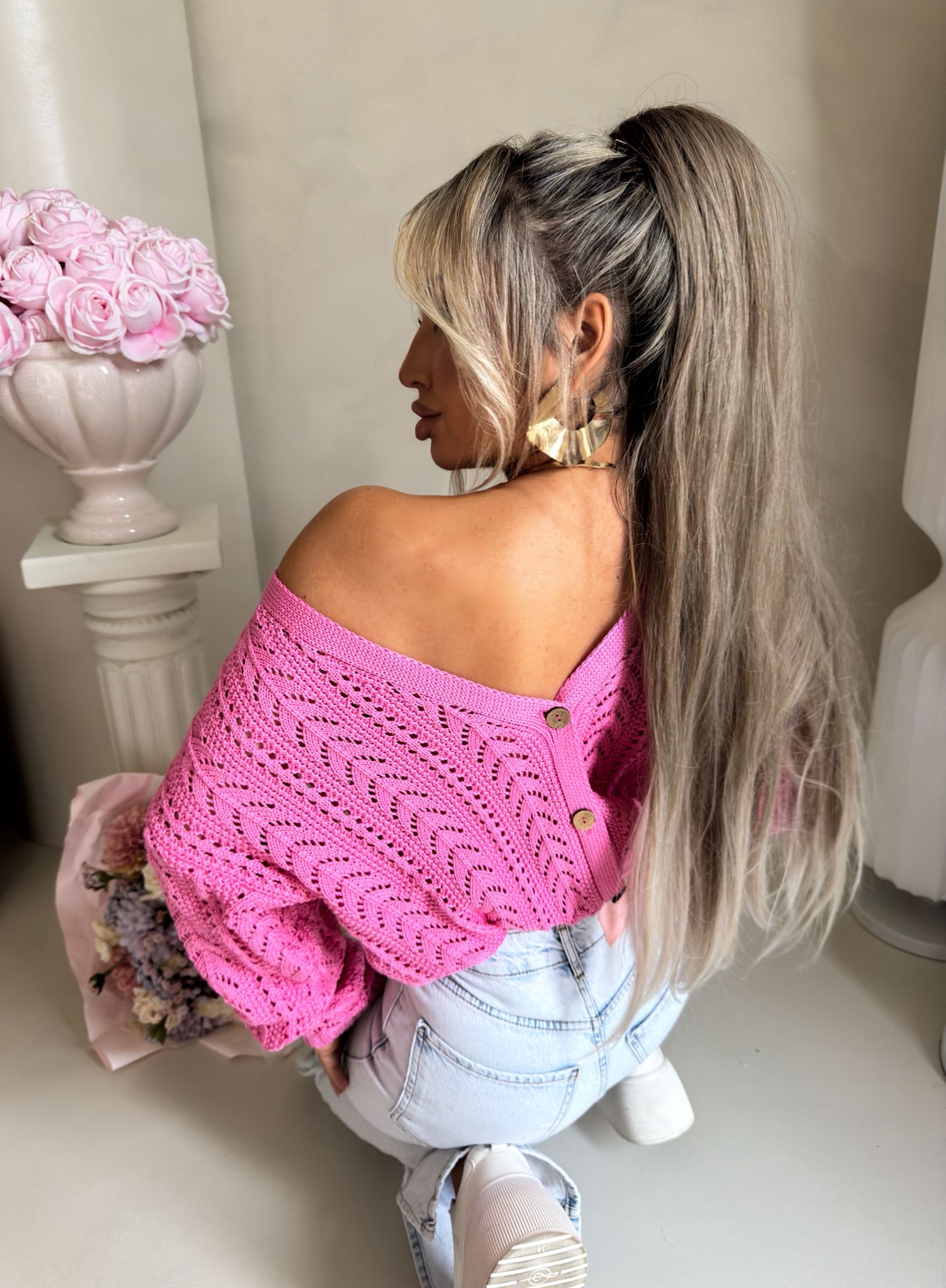 Sweter z dzianiny o ażurowym, dekoracyjnym splocie, który nadaje całości lekkości i subtelnego charakteru. Model o krótkim fasonie z dekoltem w serek, zapinany z przodu na stylowe drewniane guziki. Długie rękawy zakończone są ściągaczami, podobnie jak dół swetra.