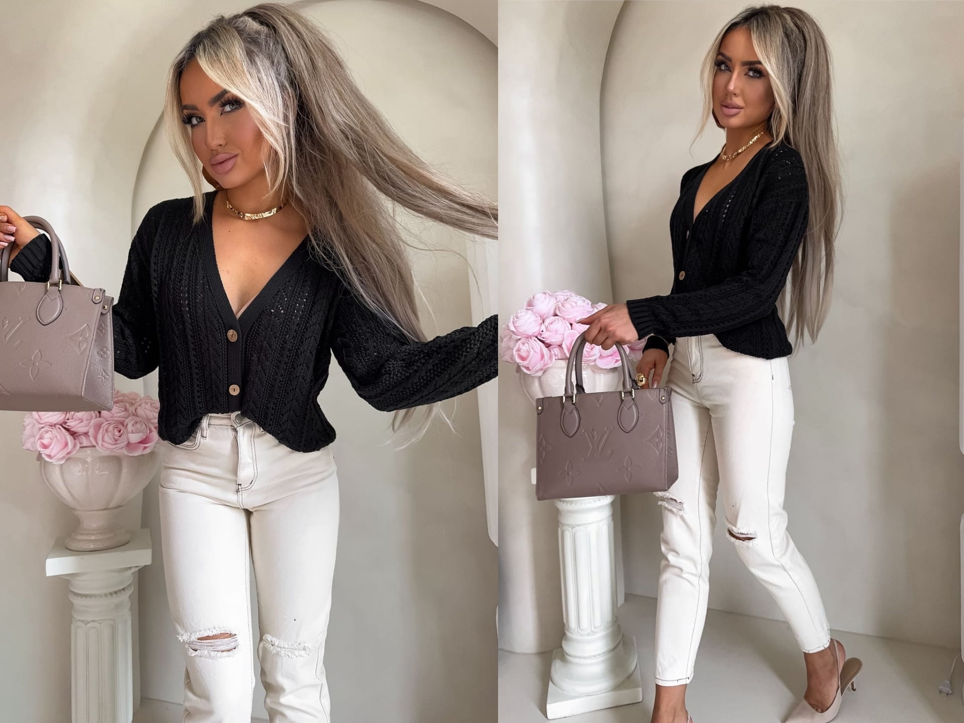 Sweter z dzianiny o ażurowym, dekoracyjnym splocie, który nadaje całości lekkości i subtelnego charakteru. Model o krótkim fasonie z dekoltem w serek, zapinany z przodu na stylowe drewniane guziki. Długie rękawy zakończone są ściągaczami, podobnie jak dół swetra.