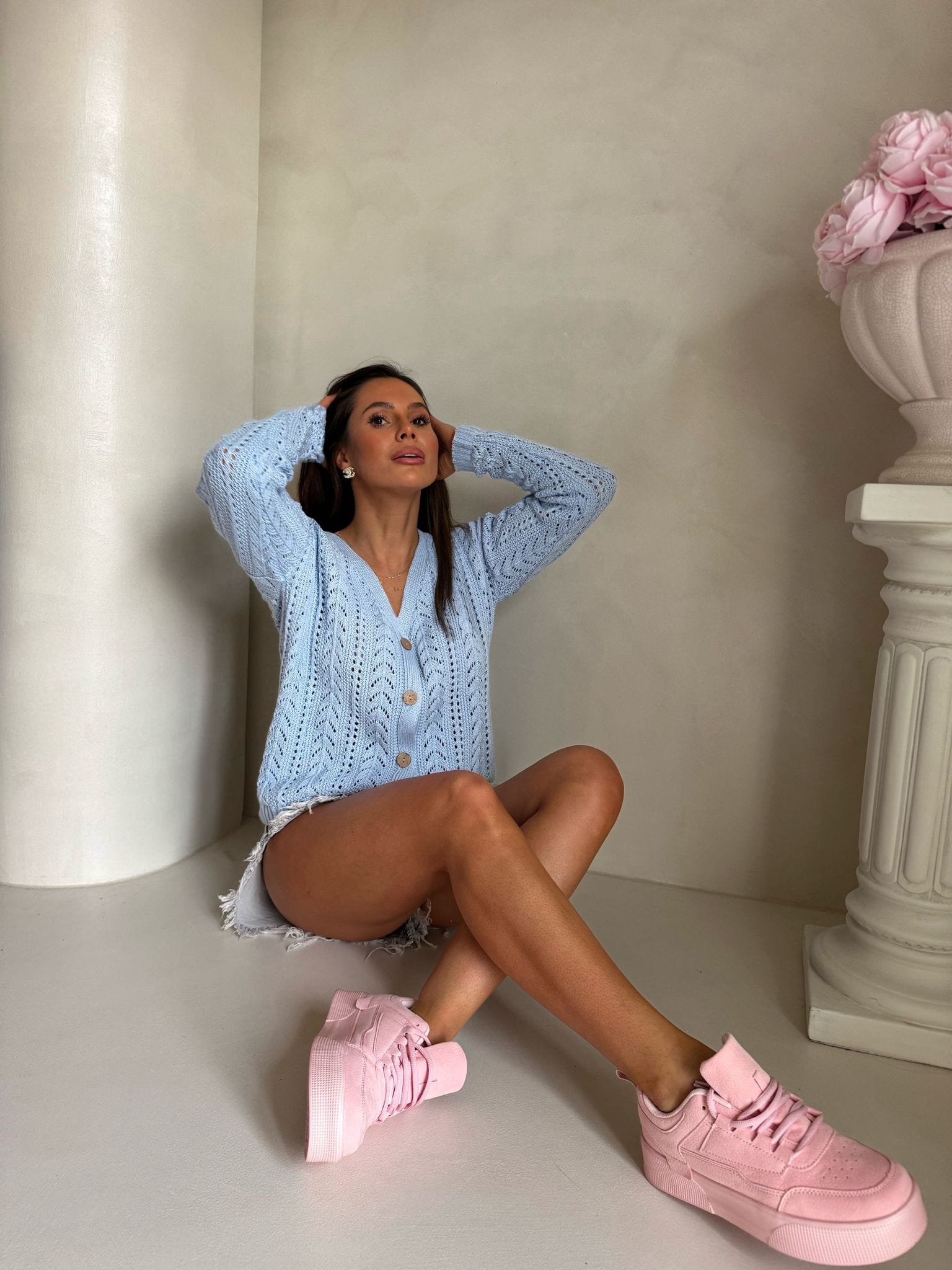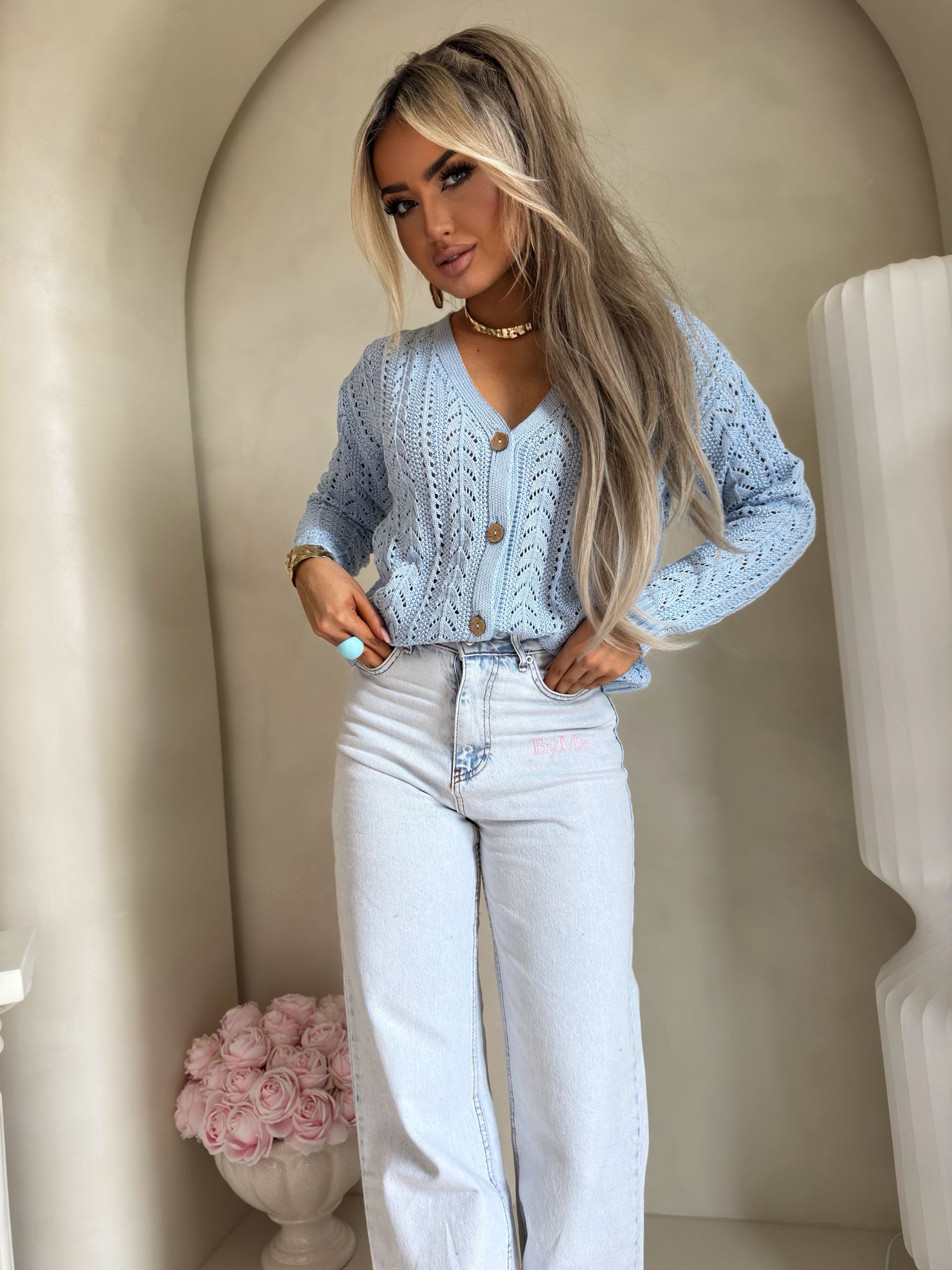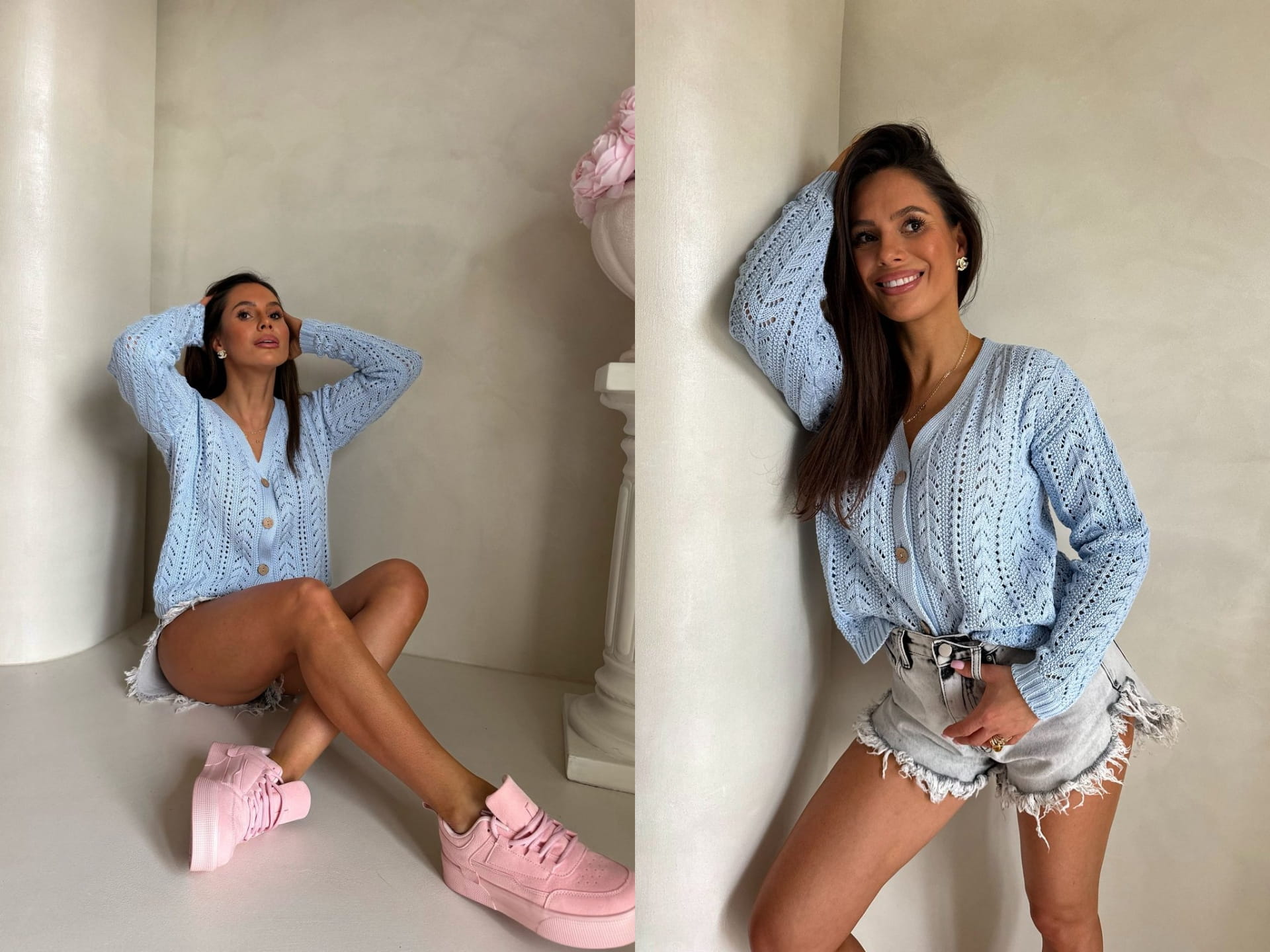 Sweter z dzianiny o ażurowym, dekoracyjnym splocie, który nadaje całości lekkości i subtelnego charakteru. Model o krótkim fasonie z dekoltem w serek, zapinany z przodu na stylowe drewniane guziki. Długie rękawy zakończone są ściągaczami, podobnie jak dół swetra.