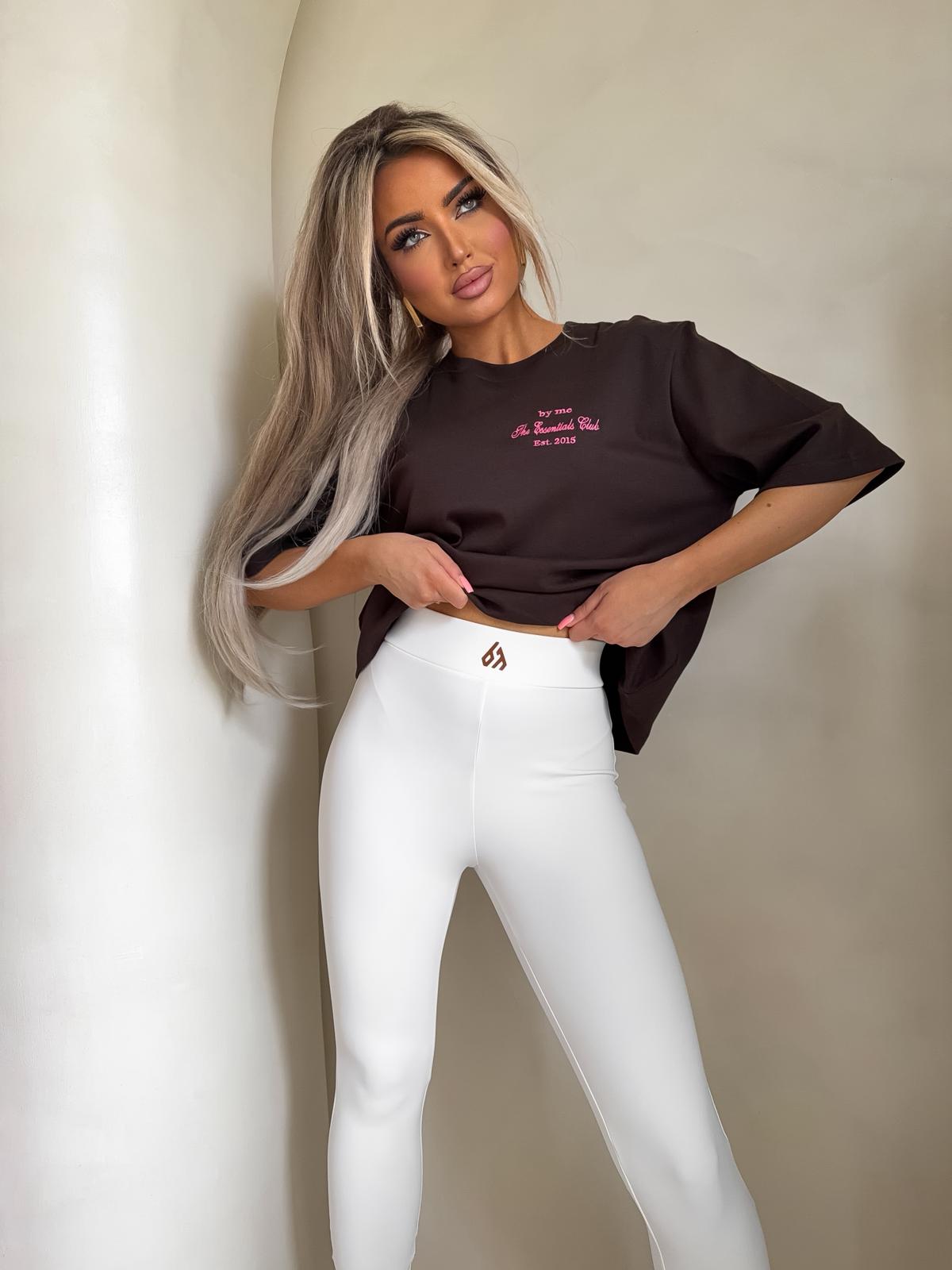T-shirt o luźnym, oversize’owym kroju z szerokimi rękawami. Na przodzie znajduje się subtelny haft. Dekolt jest klasyczny, okrągły.