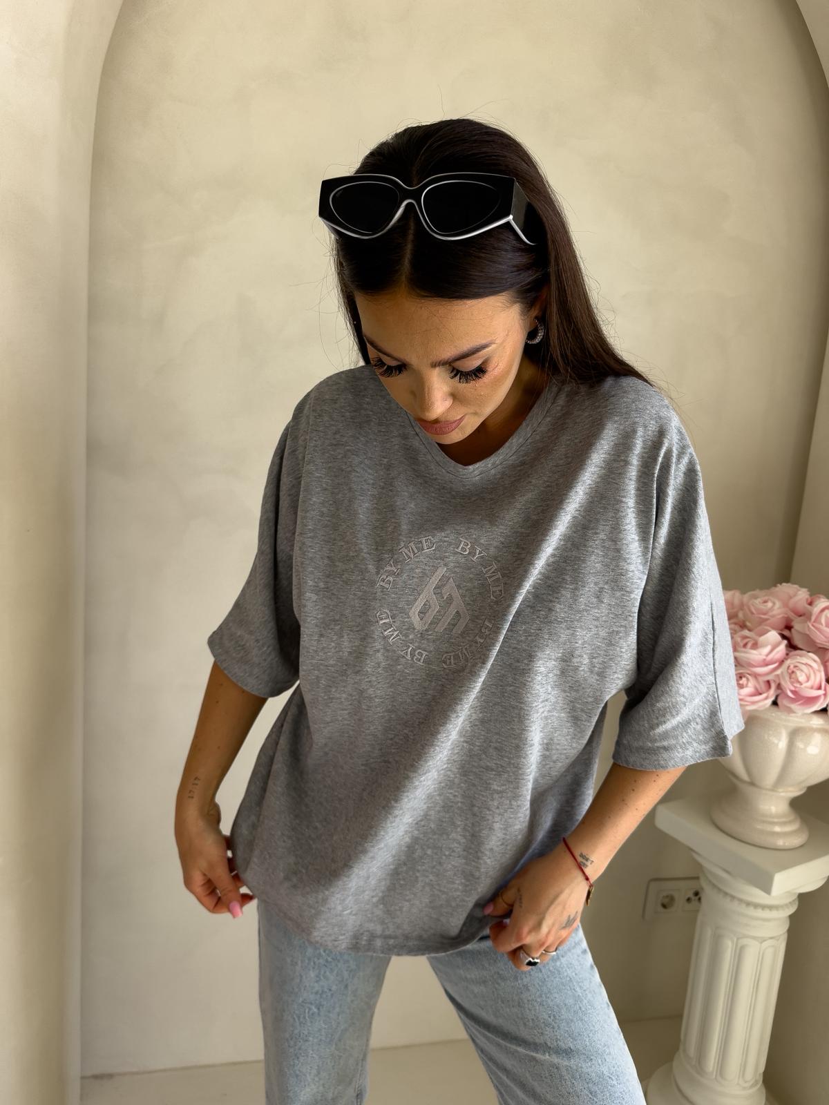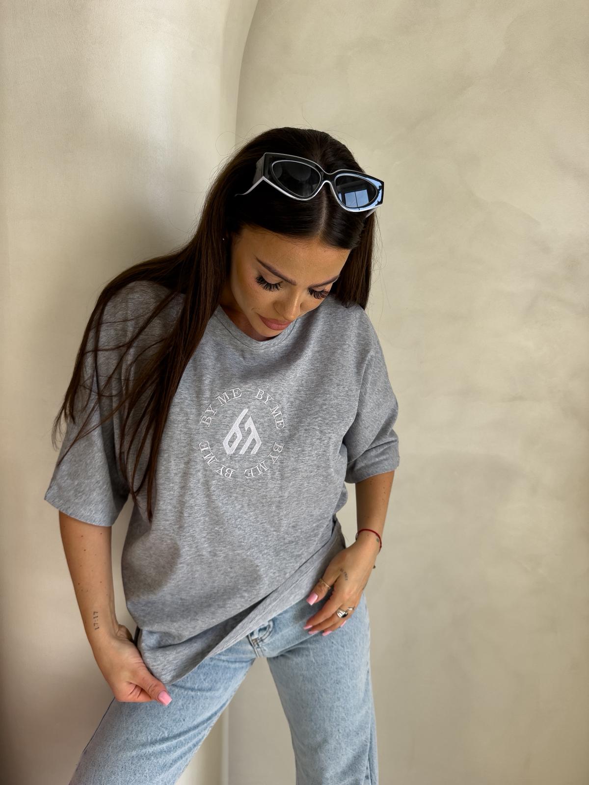 T-shirt o luźnym, oversize’owym kroju z szerokimi rękawami. Na środku znajduje się subtelne logo – okrągły nadruk z napisem „BY ME” oraz minimalistycznym symbolem w środku. Dekolt jest klasyczny, okrągły.